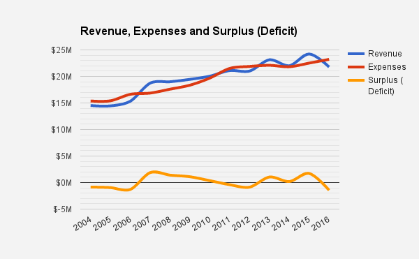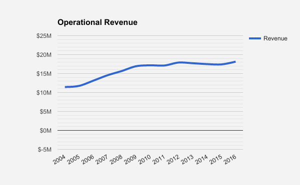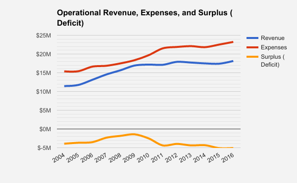 Take a look at that blue line for revenue — why is it so wavy? Our revenue largely comes from maintenance fees, which, until the end of the 2016 fiscal year, hadn’t changed in several years. Most of the rest of the revenue categories are similarly fixed year-to-year: commercial rent, laundry room income, and parking fees. So why the instability?