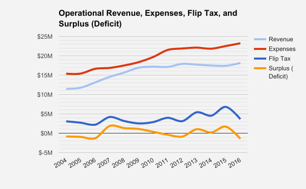 In this chart, I’ve added another revenue line for the flip tax, and the surplus/deficit line has been adjusted to include this additional revenue. (If you were to add these two blue revenue lines together, you would get the original chart at the top of this post.)